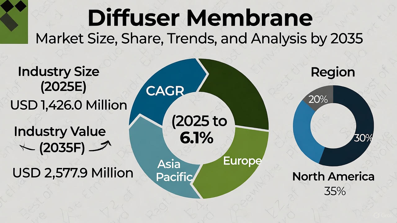 NEWARK, DE, UNITED STATES, November 11, 2025 /EINPresswire.com/ -- The global diffuser membrane market is on track for strong, sustained growth, projected to reach USD 2,577.9 million by 2035, expanding at a CAGR of 6.1% from its estimated USD 1,426.0 million valuation in 2025. This surge reflects the rising demand for efficient aeration systems across wastewater treatment, aquaculture, and food and beverage fermentation industries.
