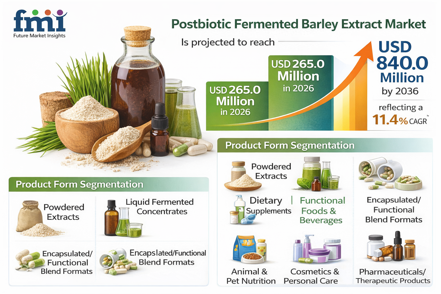 NEWARK, DE, UNITED STATES, March 3, 2026 /EINPresswire.com/ -- The global postbiotic fermented barley extract market is entering a clinically driven growth phase. Valued at USD 240.0 million in 2025, the market is projected to reach USD 265.0 million in 2026 and expand significantly to USD 840.0 million by 2036, registering a CAGR of 11.4%.